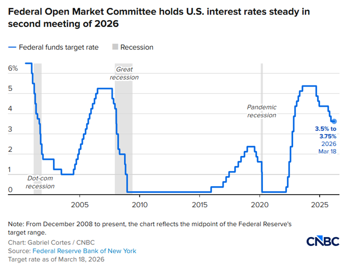 The Federal Open Market Committee voted 11-1 to keep the benchmark federal funds rate anchored in a range between 3.5%-3.75%. The policymakers are navigating their way through higher-than-expected inflation readings, mixed signs on the labor market and a war. In its post-meeting statement, the Fed made few changes to its view on the economy, with a slightly faster pace of growth and higher inflation projections for the full year. This pause signals continued rate stability in the near term, with policymakers still projecting the possibility of one rate cut later in 2026.