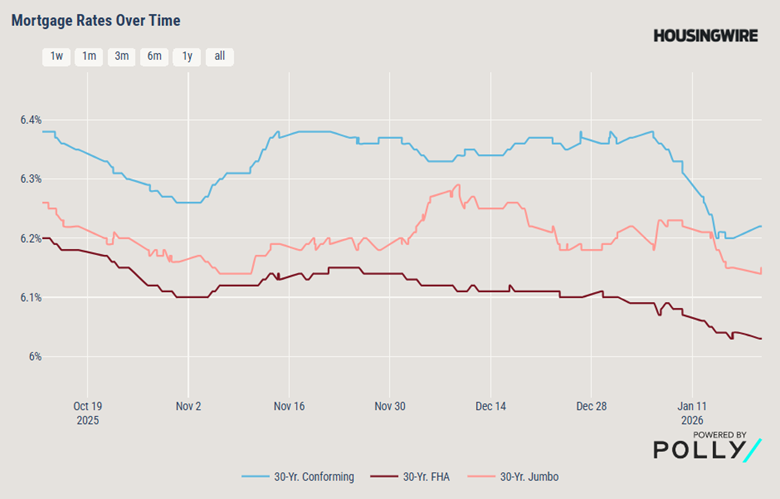 Mortgage rates dipped early in the week to their lowest point since 2022, then stabilized and inched slightly upward by January 22nd. Markets continue to expect multiple Fed rate cuts later in 2026, potentially bringing the fed funds rate down from 5.0% to 3.0% by year‑end. The week was driven mostly by Treasury yield movements and mortgage‑market sentiment.