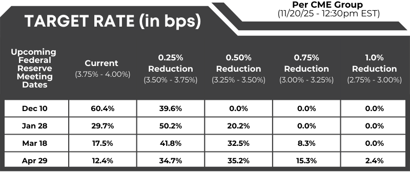 Fed Watch: Target rate (in bps) possibilities, according to the CME Group (as of 11/20/2025 – 12:00PM EST):